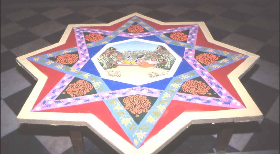 As a traditional art of Vraja, Lord Krishna’s homeland, sañjhi is intrinsically linked to the transcendental sports of the divine couple Krishna and Radha, whose play of love is depicted in the sañjhi designs. Vaishnava theology traces the origin of sañjhi to the divine lila itself: sañjhi designs were created by Radha in order to evoke Lord Krishna’s presence. Folk mythology also holds another version of the same lila, according to which it was Lord Krishna who, at evening twilight time, prepared a beautiful image of Radha made of flowers in order to appease her.
