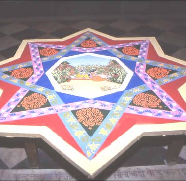 The early tradition of preparing sañjhis made of cowdung and flowers, which is still practiced in the villages, has been taken up by the Vaishnava temples and developed into a highly sophisticated art form practiced by specially trained Brahman priests. The major type of temple sañjhi is prepared from dry colors upon an octagonal earthen platform symbolizing an eight-petalled lotus. The heart (hauda) of the design constitutes the seat of the divine couple, the sanctum sanctorum; from here, an intricate layout of artfully interlocked diagonal patterns enables the expansion of divinity towards the eight directions. The worship of a mystic design as in sañjhi is rooted in early Hinduism and Tantrism, and has obvious parallels in Vajrayana and Mahayana Buddhism. In both cases, song rendered in front of the design constitutes the central element of worship.